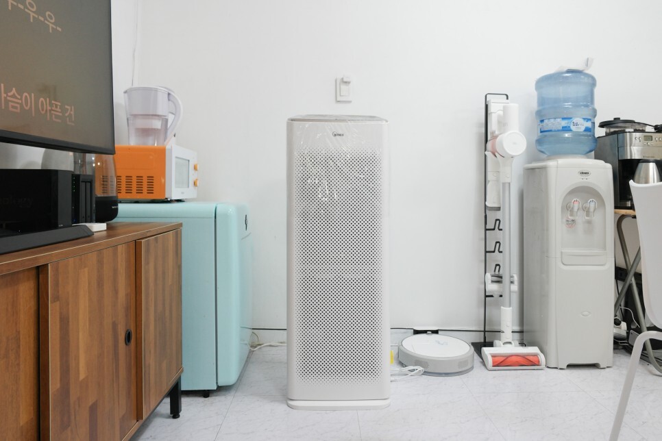 사무실에 있던 기존 공기 청정기의 용량이 적어서 집으로 옮기고 수직으로 쏘아올리는 청정함 ‘듀얼 에어제트’ 위닉스 마스터 공기청정기를 배치했습니다.