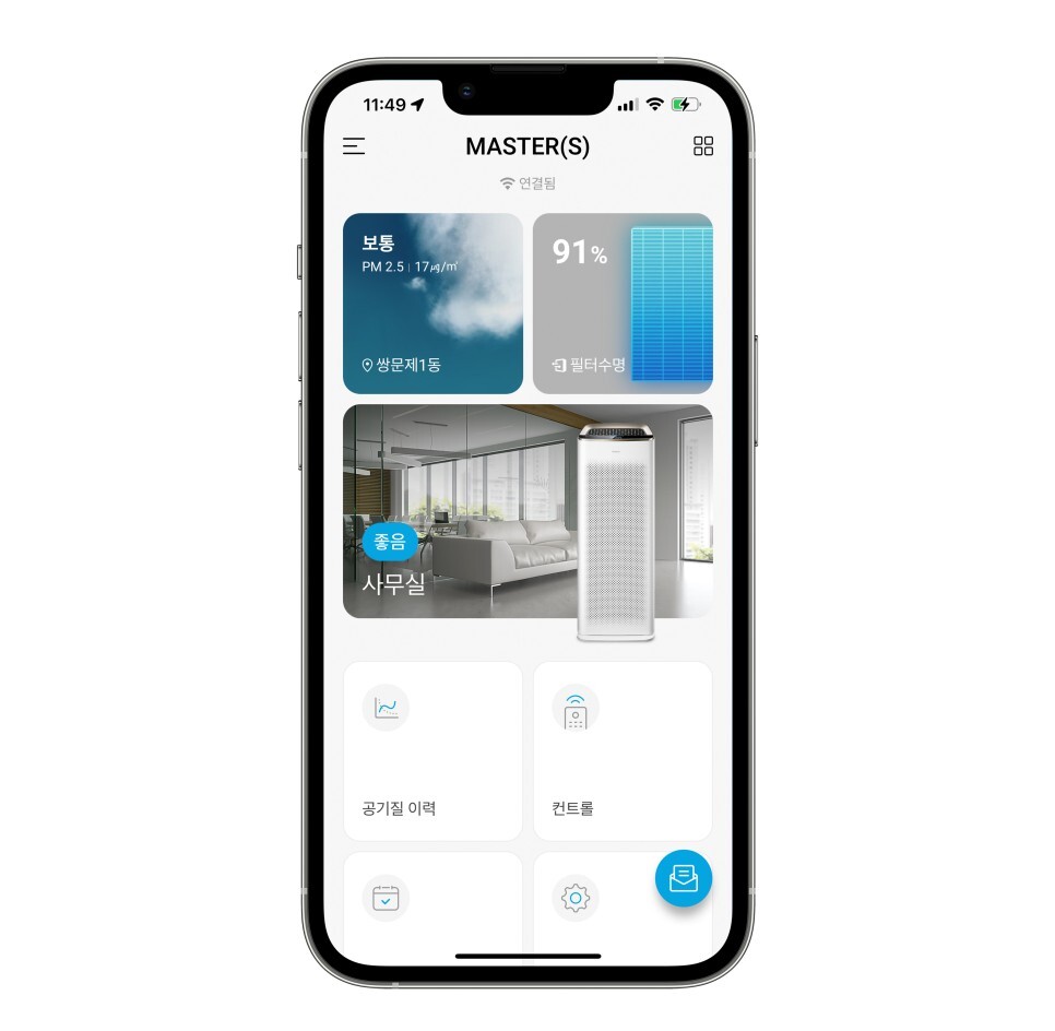 연결을 하면 현재 저희 회사가 있는 곳의 미세공기 지수를 표시해주고 있고 필터의 수명을 보여주고 있습니다. 지역의 미세먼지 현황을 보여주기 때문에 미세먼지 지수를 보고 위닉스 마스터를 컨트롤할 수 있습니다.