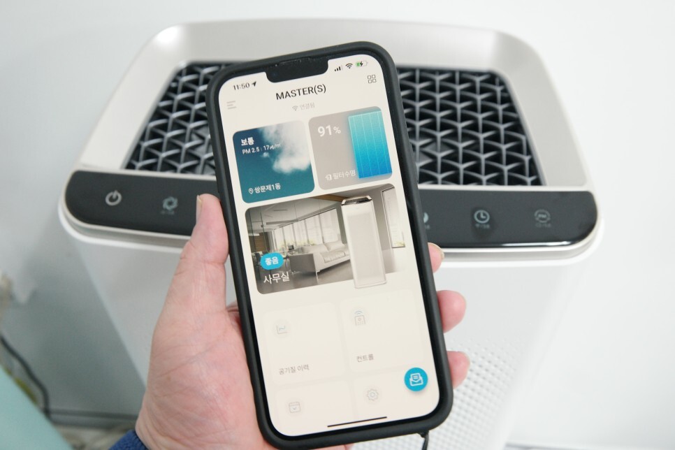 사진은 바로 앞에서 찍었지만 실제 사용은 제 책상에서 하고 있습니다. 저는 사무실 들어가기 전에 미리 스마트폰으로 켜두면 바로 청정한 실내에서 업무를 볼 수 있어 너무 만족스러웠습니다.