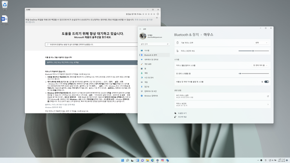 장치에 연결이 되어 있는 무선 마우스 항목에 바로 가기 메뉴 - 문제 해결을 클릭을 하여 해결을 할 수도 있습니다.