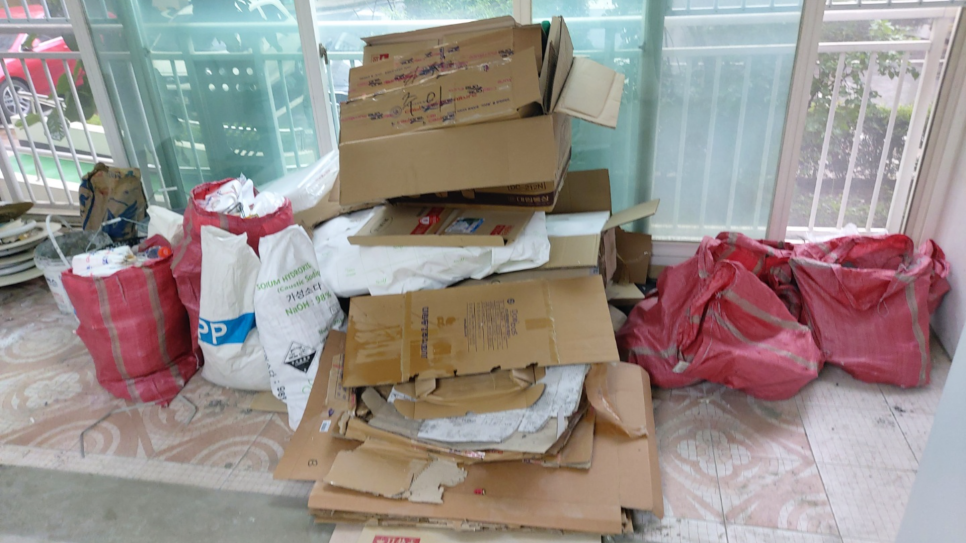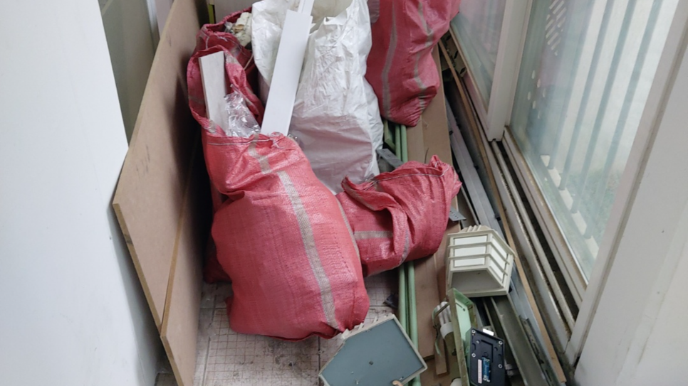 베란다 창고 같은 경우에는 쓰지 않는 물건이나 여름옷, 겨울옷을 보관하시는 분들도 많고, 생활 공간으로도 사용하는 경우도 많이 있습니다. 이번에는 인테리어를 하면서 쓰래기를 옮겨 놓았습니다.