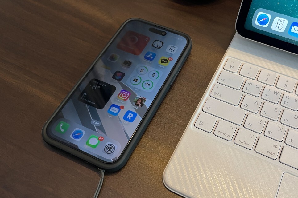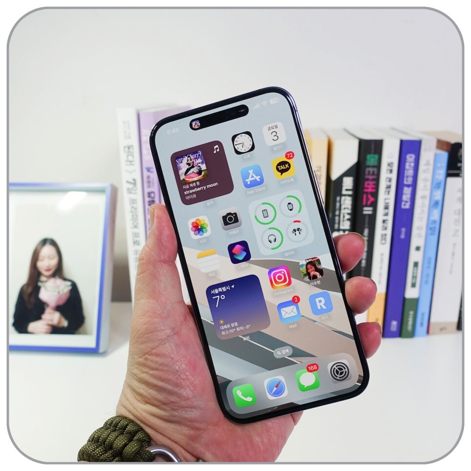 부착을 완료한 상태에서 정면에서 사진을 찍어 보았습니다. 약간 어두워진 것 같은 느낌도 들지만, 아이폰 14프로 맥스에서 사용하는 데는 전혀 문제가 없습니다. 아이폰에 사생활 보호필름을 붙이면 페이스 아이디가 안된다는 의견이 있는데, 편광을 이용한 제품이다 보니 화면의 밝기를 높이면 문제없이 페이스 아이디가 잘 작동합니다.