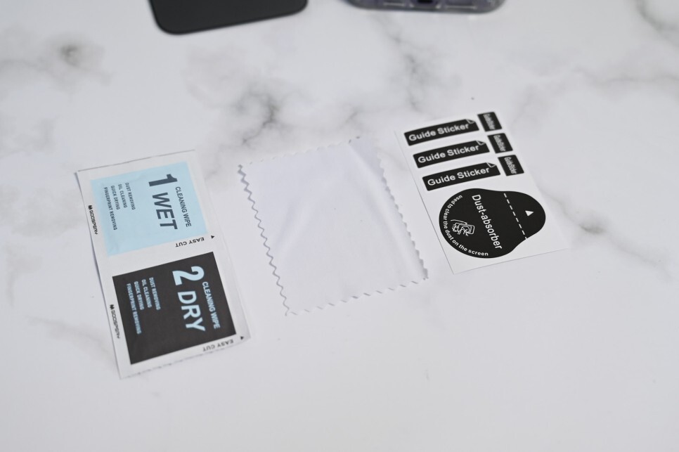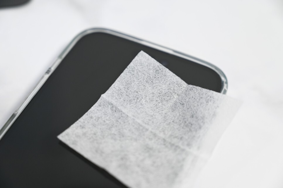 렌즈와이프로 지문을 닦아주고 드라이 와이프로 닦아주시면, 드라이와이프에 정전기 방지 기능이 있어서 먼지가 잘 붙지 않아서 부착이 매우 용의 하게 됩니다.