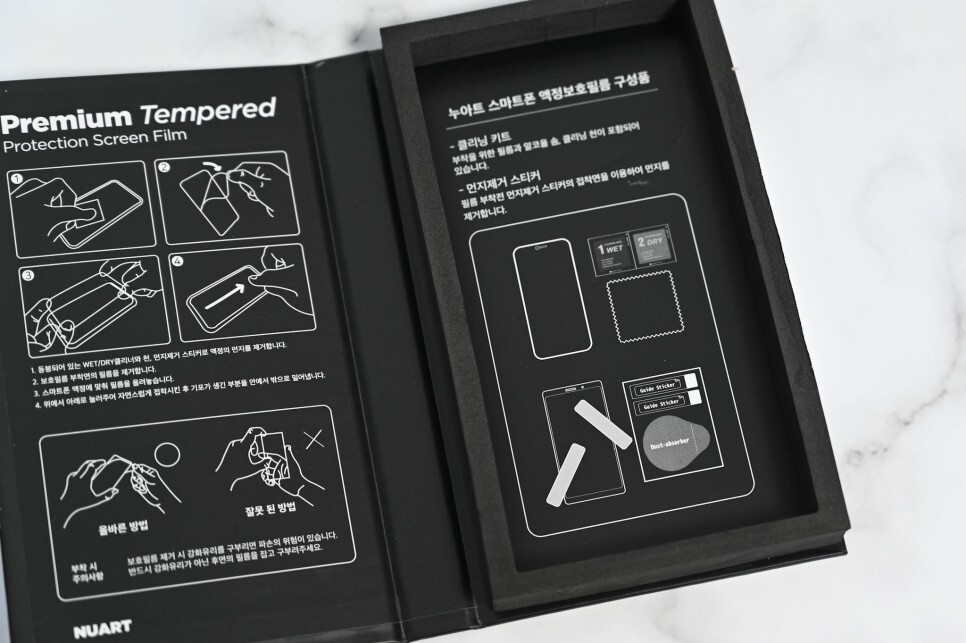 패키지를 보면 누아트 아이폰 14프로맥스 강화유리 사생활 보호필름은 검은색으로 된 조금 두꺼운 박스에 강화유리 보호필름이 2세트가 들어있습니다. 내용물에 비하여 박스가 두꺼운 것은 택배 운송 중 제품 파손을 방지하기 위한 것 같습니다.