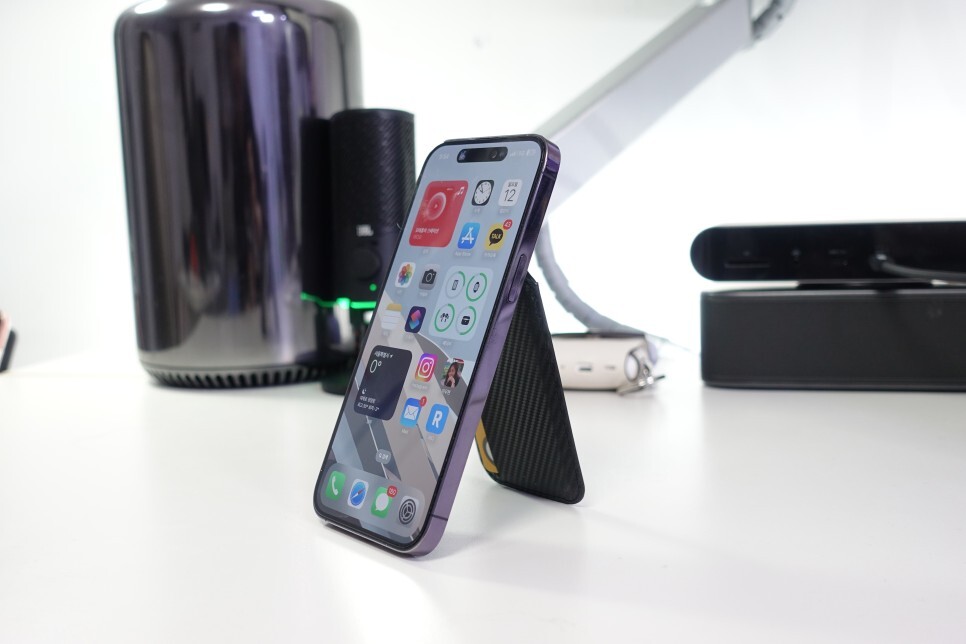 아이폰14프로 사용하면서 편리한 점을 꼽으라면 다양한 기능성과 편의성 이외에도 맥세이프를 이용한 거치 방식이라고 할 수 있습니다. 자석으로 거치를 하거나 카드지갑 등을 붙이고 다닐 수 있다는 것입니다.