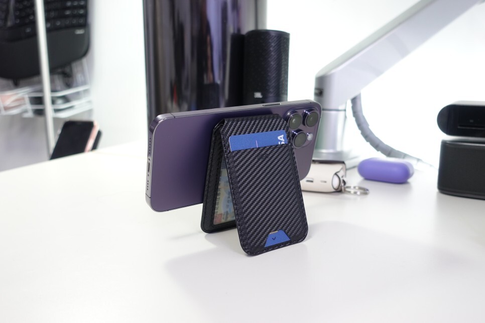 맥세이프 카드지갑을 스마트폰에 부착해 사용하는 모습입니다. 많이 고급스럽습니다.