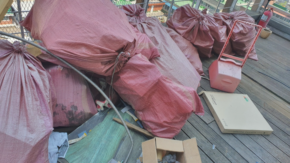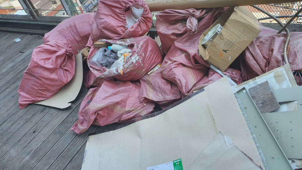 옥상이 따로 있는 건물이나 폐기물을 둘 만한 공간이 없는 건물 같은 경우에는 옥상에 보관하시는 경우가 많으신 듯 합니다. 이 경우 5톤 미만 집안청소나 인테리어하고 남은 잔재물로 분류하여 사업장 생활계로 분류하여 중량구 폐기물처리를 하게됩니다.