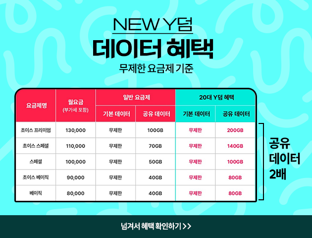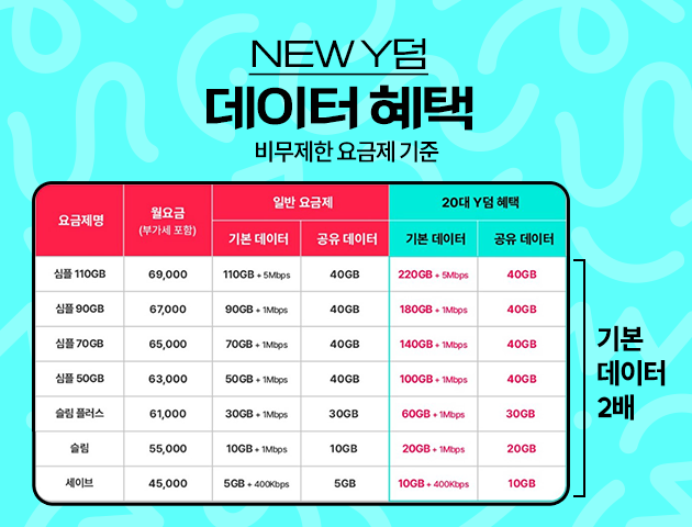 Y덤 대상요금제에 해당되면 데이터 2배 혜택을 받을 수 있다고 합니다. 기본데이터는 물론 공유데이터까지 20대에게만 제공되는 무료 혜택입니다.