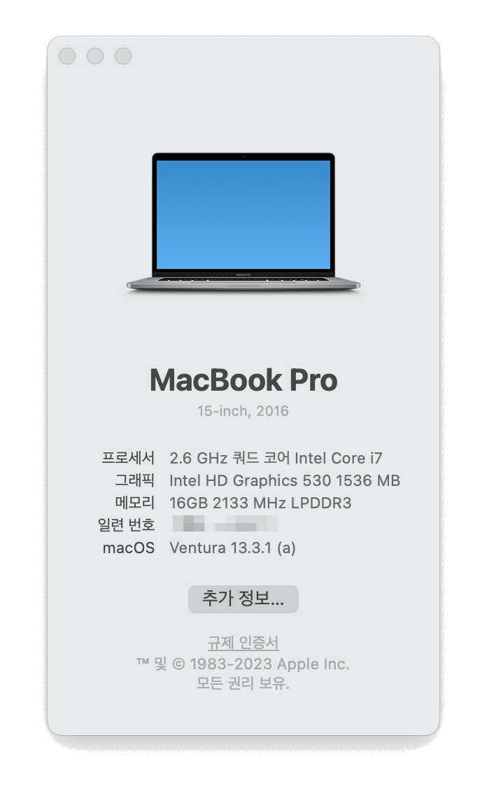 맥북프로 15인치 터치바는 벤츄라를 지원하지 않고 있습니다. 맥북프로 15인치 터치바 2016년식은 그리 오래되지 않은 제품에 OS 지원을 끊어버린 것이라 조금 당황했었습니다.