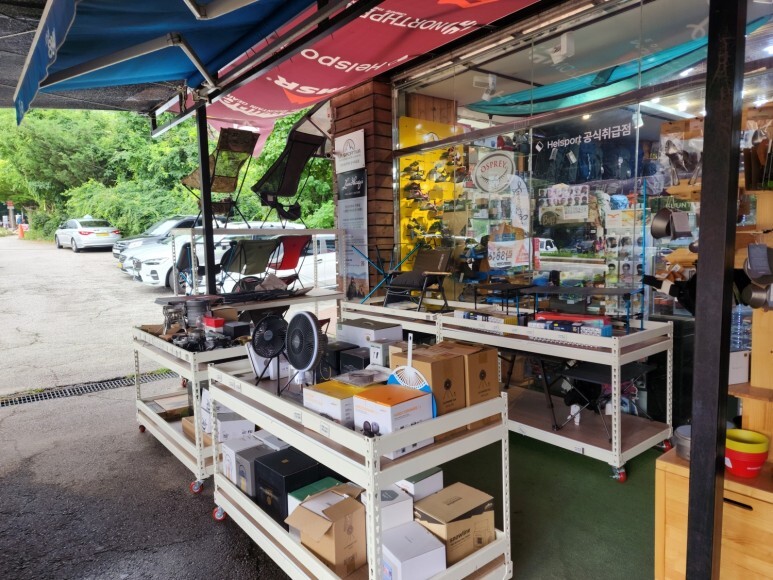 캠핑용품은 창고형 판매로 디스플레이 제품은 많이 없지만 캠핑페어에서나 볼 수있는 노스피크, 스노우라인, 코베아, 헬리녹스를 판매하고 있습니다.