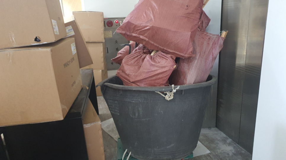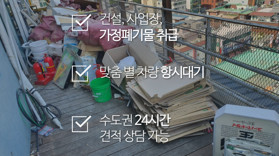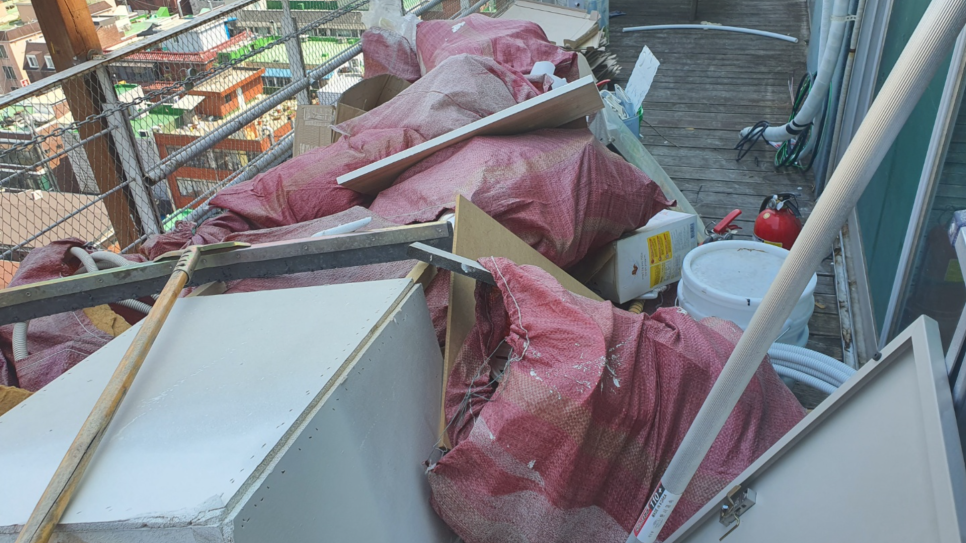 옥상이 따로 있는 건물이나 폐기물을 둘 만한 공간이 없는 건물 같은 경우에는 옥상에 보관하시는 경우가 많으신 듯 합니다. 이 경우 5톤 미만 집안청소나 인테리어하고 남은 잔재물로 분류하여 사업장 생활계로 분류하여 중량구 폐기물처리를 하게됩니다.