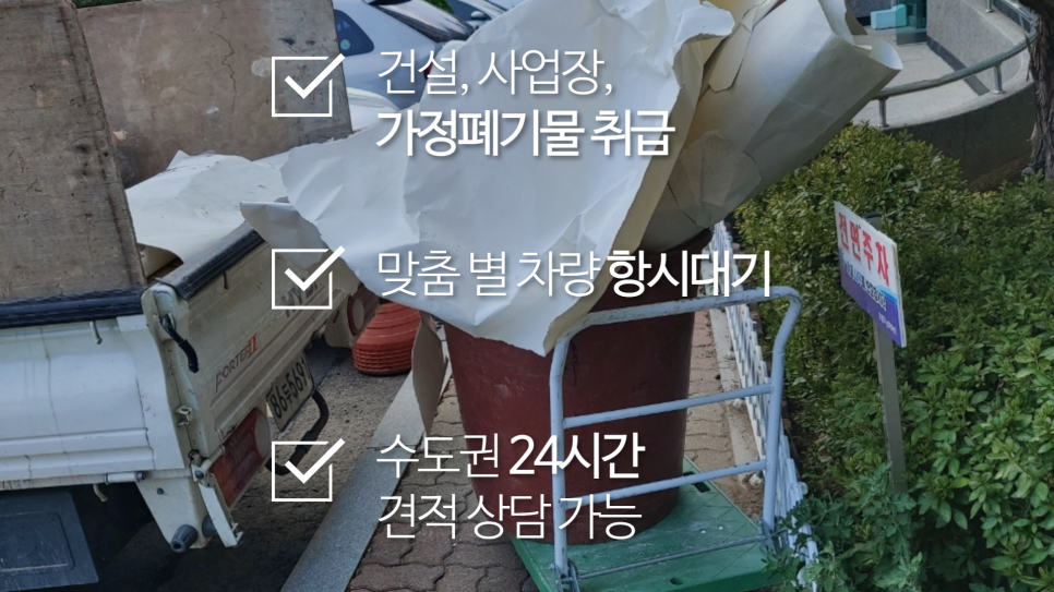 소량에 폐기물부터 대량 폐기물까지 전부 처리가 가능하며, 폐기물이 5t 이상 나오면 신고해야 하는데 신고 대행도 해드리고 있습니다.