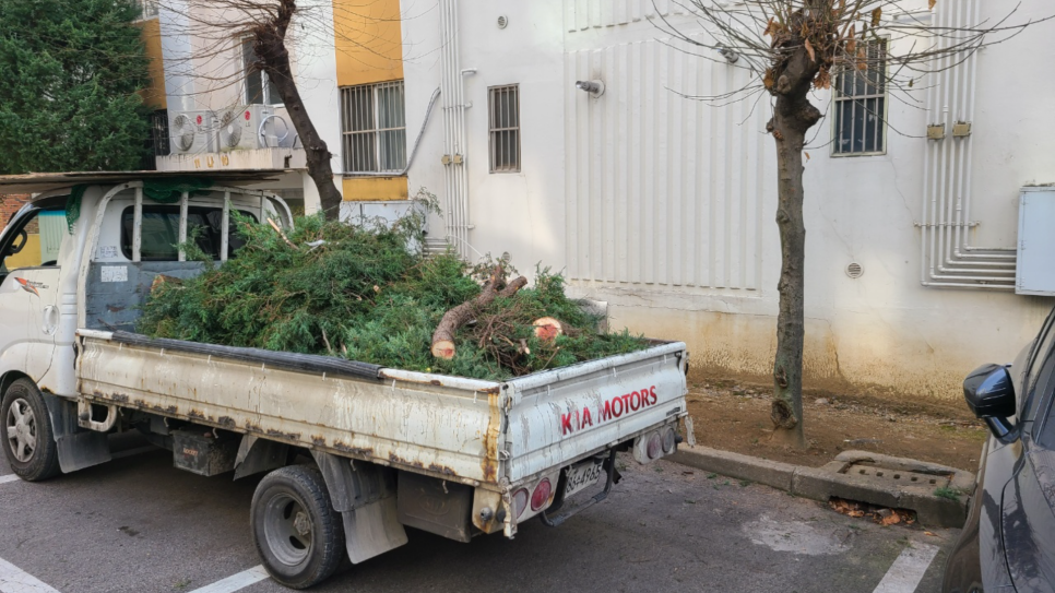 묶여있는 가지들부터 트럭에 차곡차곡 옮겨주고, 떨어지는 자잘한 잔가지들도 정리한 뒤에 실어 날라주었습니다.폐목을 빠짐없이 실어 날라주고 현장 주변을 깔끔하게 청소하여 마무리했는데요.