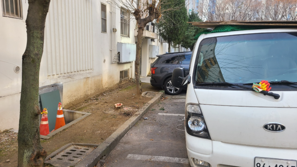 아파트 같은 경우에는 조경 작업을 하고 나무의 가지를 정리하고 자르다 보면 둘만한 공간이 부족하여 길가에 두거나 현장처럼 주차장 구석에 두는 경우가 있습니다.