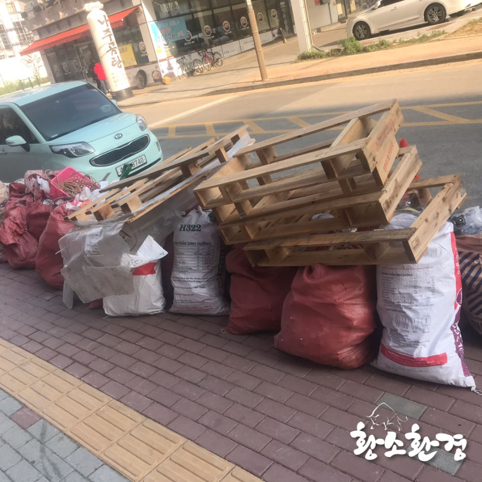 마대 자루를 전부 실어 날라주고 주변에 있는 통과 플라스틱, 기타폐기물도 빠진 것이 없도록