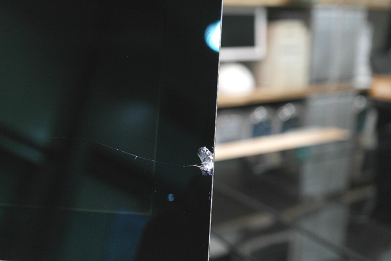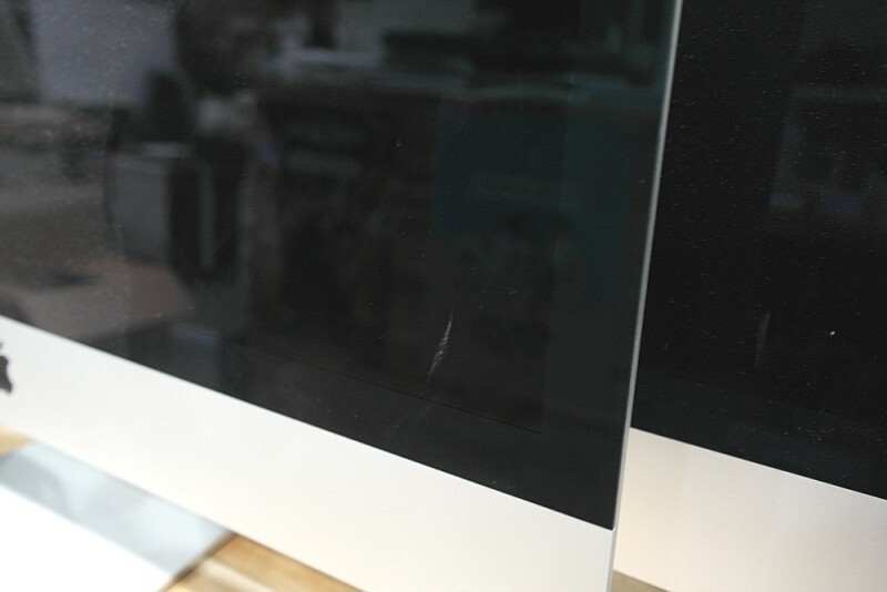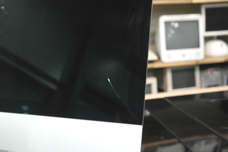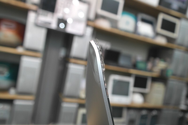 어떤 경우에도 모서리에 충격이 가해지면 아이맥의 전면 디스플레이는 약 1m 정도의 두께로 즉시 파손이 생겨 버립니다 . 조심 조심 손가락으로 누르는것도 조심해야 합니다 .