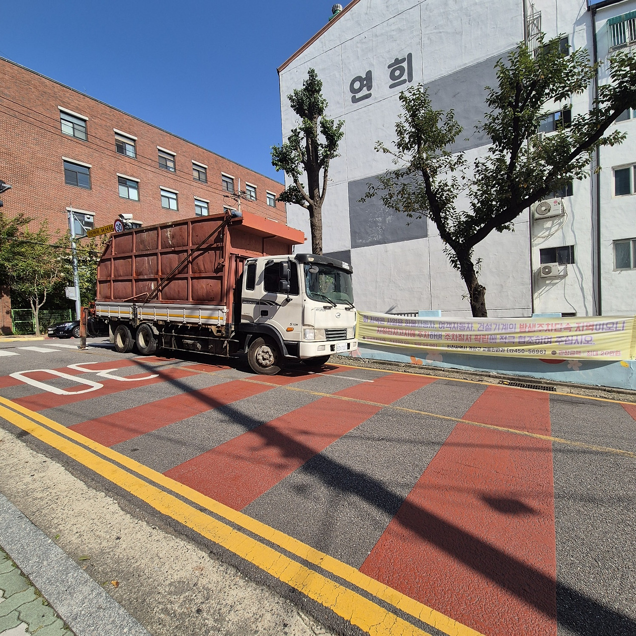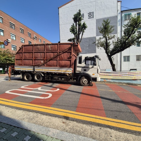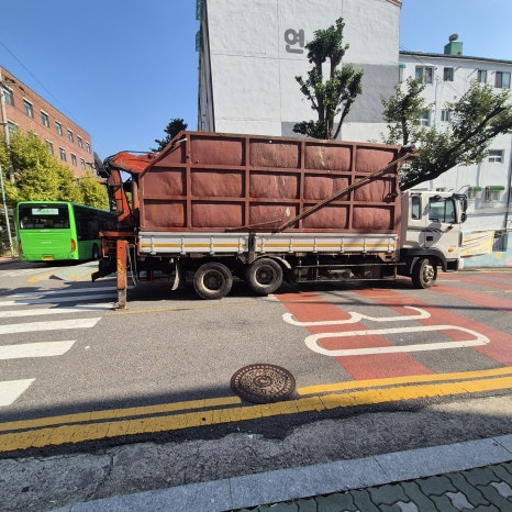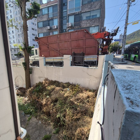 5톤 집게차가 아파트 단지 안으로 들어갈 수가 없는 구조다 보니 담벼락 바로 앞에 차량을 세팅하고