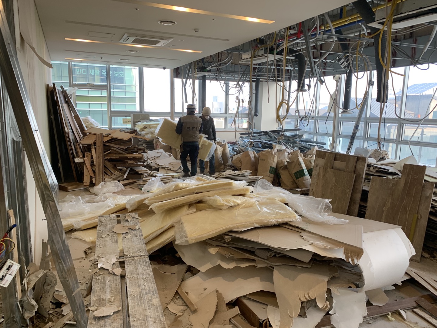 바닥에 금세 처리해야 할 친구들이 쌓이고 있네요다음 작업들을 바로 수월하게 이어가려면 중간중간 쌓여져있는 스펀지와 천장 철거 자재들을 치워주면서 진행합니다.