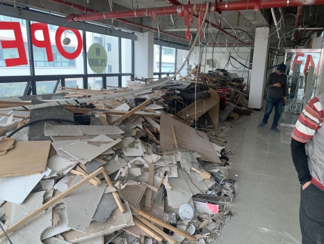 바닥에 쌓인 물량은 스카이 차를 이용해 적재 처리하면서 천장 철거를 이어서 진행해 보았습니다. 천장 부분까지 철거 진행이 잘 되고 있습니다.