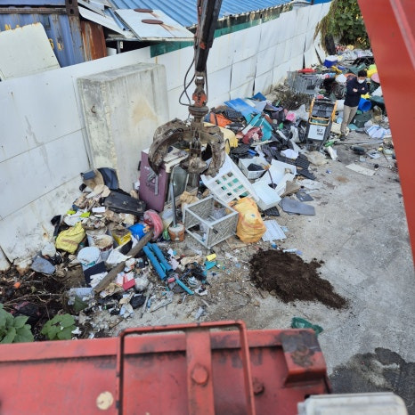 쓰레기가 참 많죠 오늘 최대한 많은 물량을 처리해 드리려고 5톤 집게차를 데리고 왔지만 물량을 싹 다 정리하진 못할 것 같고 고객님께서도 오늘은 적재 가능한 만큼만 처리해달라고 하셨던 부분이라 가능한 정도에서 최대한 정리해 드리고 갈 예정입니다.