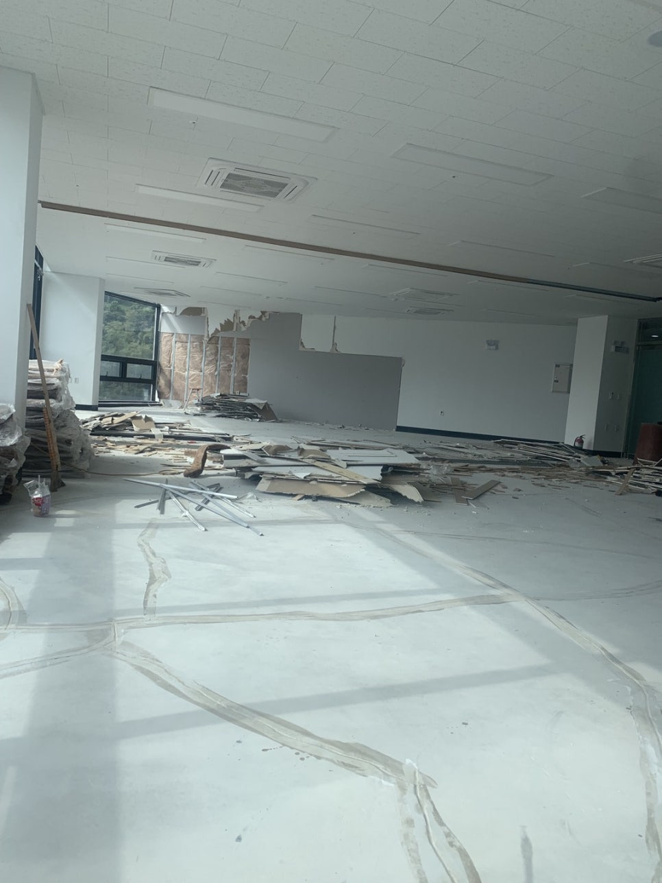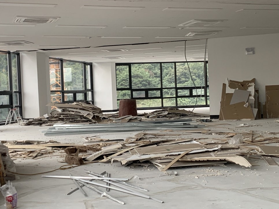 새로 지은 지 얼마 안 된 건물 내부에 있는 사무실이었는데 새로 인수하신 분이 사무실 안에 있는 가벽 철거 후 공간을 넓게 빼서 사용하신다고 하셔서 가벽 철거 진행과 자재 폐기물류까지 치워드리려고 왔습니다.