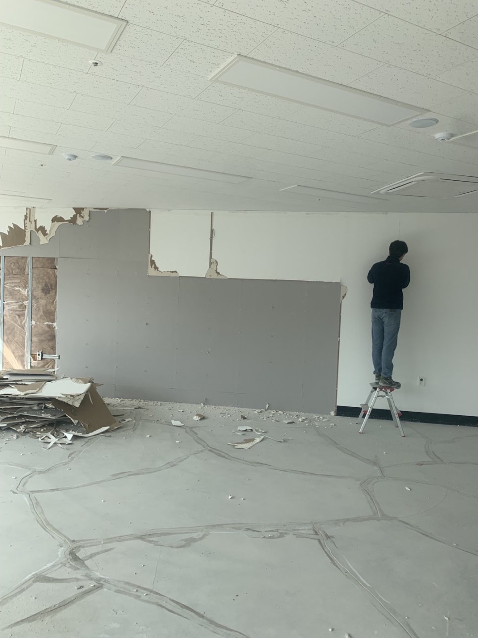작업 시작한 이후에 찍은 사진인데 가벽의 외벽부터 차례대로 철거하고 있는 중입니다.