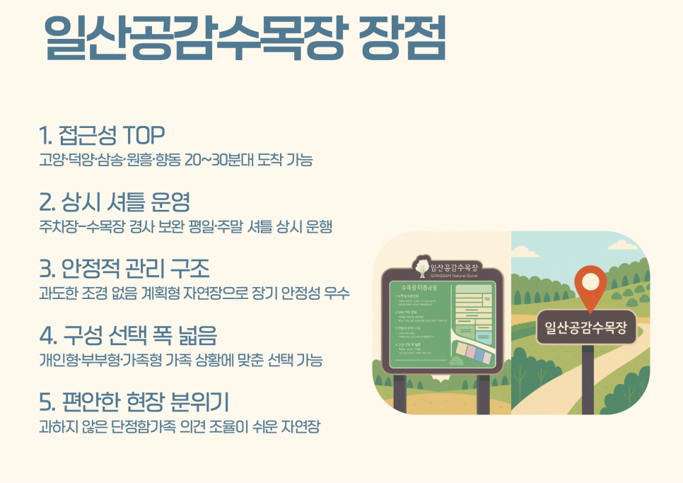 특히 실제 현장을 보면 ‘찾기 쉽다’, ‘부담이 없다’는 표현을 자주 들을 만큼 접근성과 분위기 모두에서 실사용 만족도가 높습니다. 오늘 글은 차부장이 상담 경험을 바탕으로 일산공감수목장을 왜 덕양구 가족들이 1순위로 보는지 정리해드립니다.