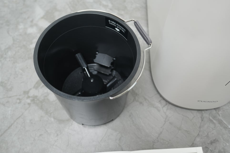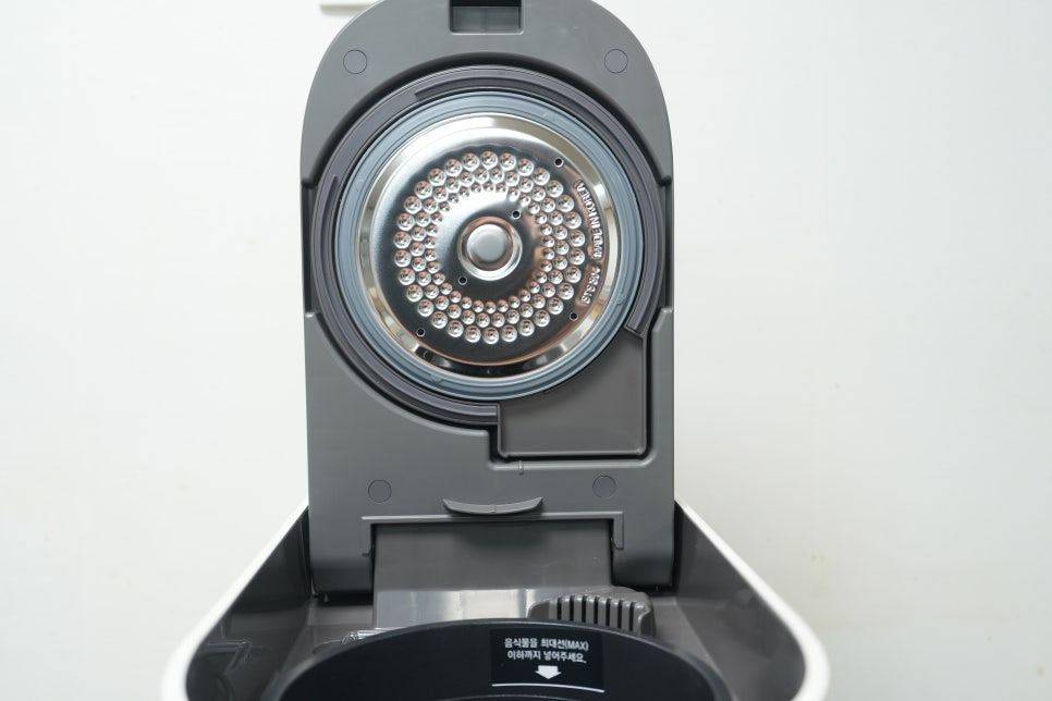패키지에는 본체 외에도 탈취 필터, 청소 솔, 설명서가 함께 동봉되어 있었으며, 내부를 열어보면 단단한 맷돌 방식의 분쇄 통이 자리 잡고 있었습니다. 한눈에 보기에도 “이건 단단한 음식물도 거뜬히 처리하겠구나”라는 신뢰감이 들었습니다.