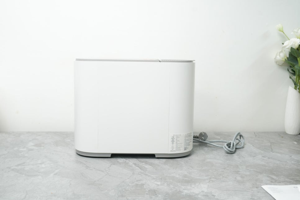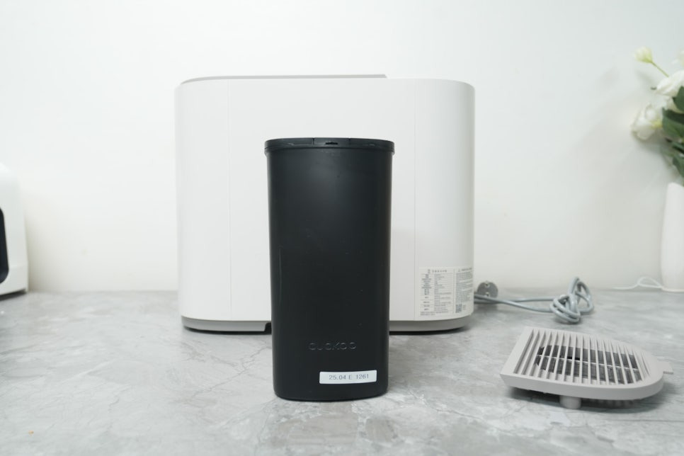 제품 크기는 딱 한 뼘 정도의 컴팩트한 사이즈로, 좁은 주방에도 무리 없이 설치할 수 있는 구성입니다. 무게도 무겁지 않아 혼자서도 충분히 옮길 수 있었고, 설치는 전원 코드 하나만 연결하면 끝나는 구조라 매우 간편했습니다. 복잡한 배수관 연결 없이 완전 독립형으로 작동하기 때문에 설치 스트레스가 거의 없습니다.