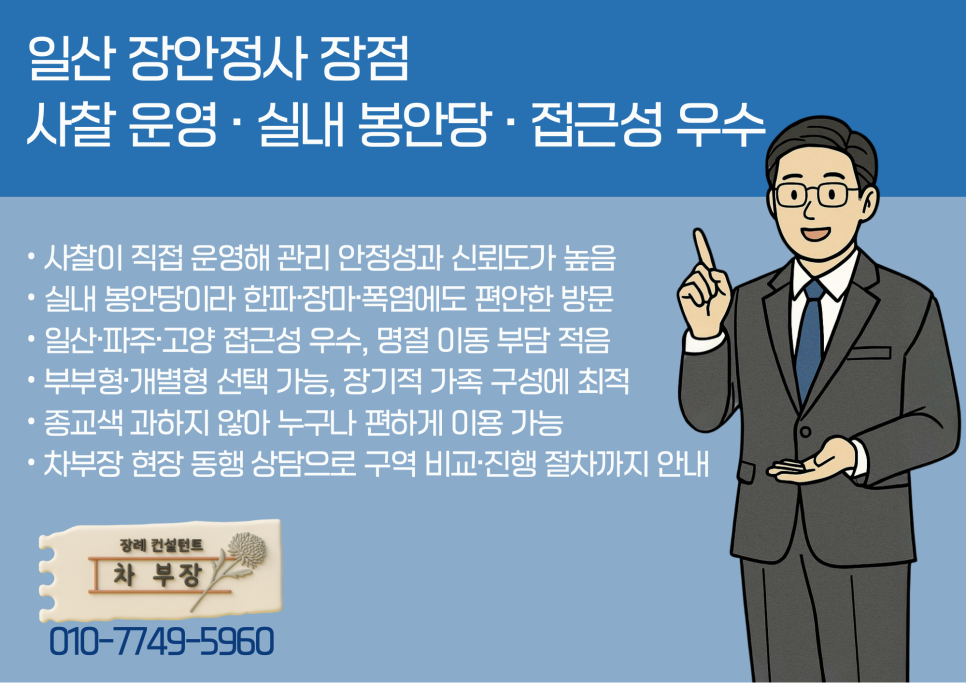 장안정사는 고양·파주·김포에서 접근성이 뛰어납니다. 특히 명절 방문 때 가장 중요한 주차 편의와 이동 동선이 좋은 편이라 가족 방문이 잦은 가정에서도 부담이 적습니다. 실내형인 만큼 날씨 환경에 영향을 받지 않으며 한파나 장마철에도 편안하게 방문할 수 있습니다. 고령 부모님을 모시고 이동해야 하는 분들이 특히 높은 만족도를 보입니다.