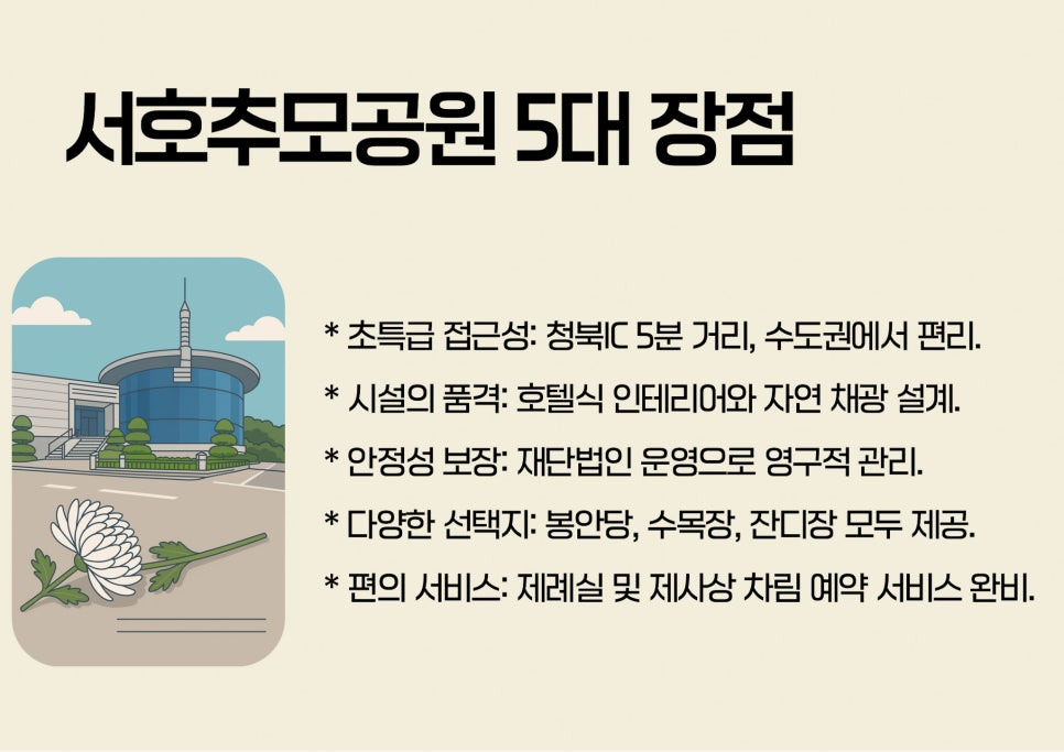 서호추모공원은 평택–제천 고속도로 청북IC에서 500m 정도밖에 떨어져 있지 않아 서울 강남 기준 40~50분대면 도착할 수 있습니다. 대부분의 유족분들이 이 점에 대해 “멀지 않다”, “올 때마다 편하다”라고 말할 정도로 교통 접근성이 뛰어납니다. 수도권 남부, 경기 서부, 충청권 일부에서도 충분히 부담 없이 방문할 수 있는 거리입니다.