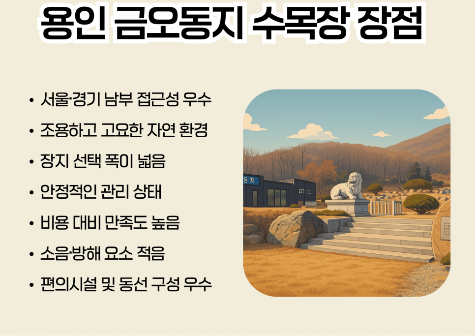 오늘은 최근 상담 문의가 빠르게 늘고 있는 용인 금오동지 수목장에 대해 차부장의 실무 경험을 바탕으로 서술형으로 안내해 드립니다. 자연 속에서 고인을 편안히 모실 수 있는 장지를 찾는 분들께 적합한 곳으로, 특히 서울·경기 남부에서 접근이 좋아 자주 추천드리는 자연장지입니다.