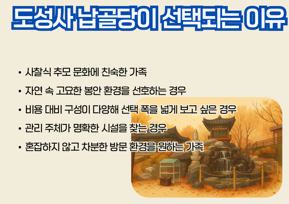 도성사는 다음과 같은 기준을 가진 가족들에게 좋은 선택지입니다.