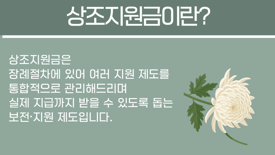 상조지원금은 장례절차에 있어 여러 지원 제도를 통합적으로 관리하여 차부장이 실제 지급까지 받을 수 있도록 돕는 보전·지원 제도입니다. 지급 대상이 넓기 때문에 대부분 모른채 지나가는 경우가 많아 상담 과정에서 꼭 확인하시는 것이 중요합니다.