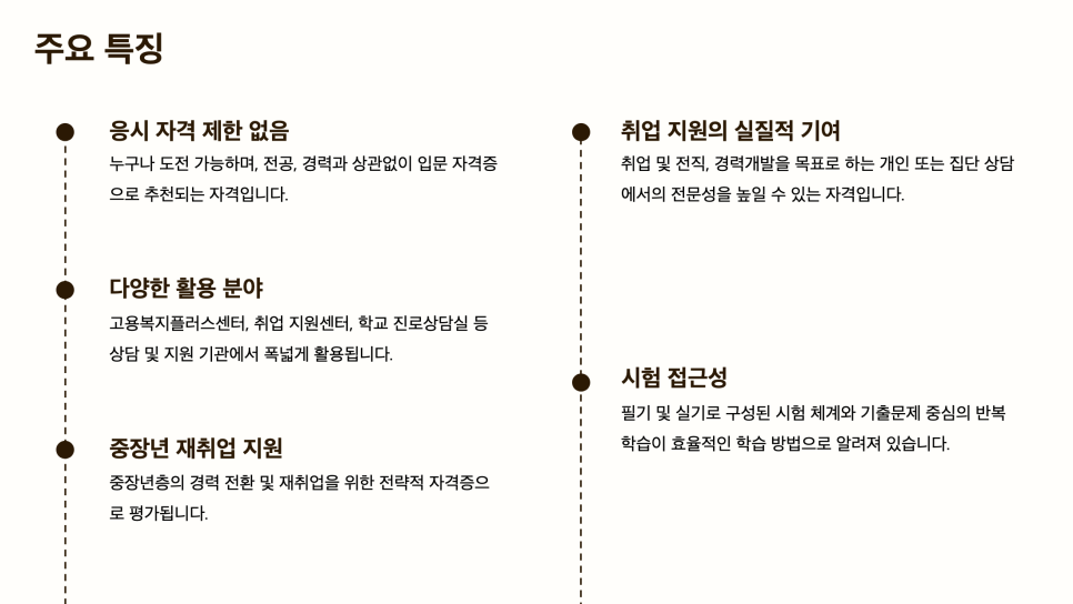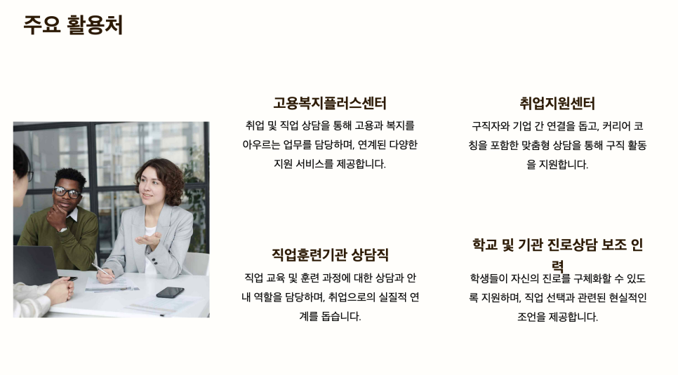 고용센터, 직업훈련기관, 취업지원센터, 학교 진로상담실 등에서 활용도가 높아 중장년 재취업, 상담 직무 전환, 공공·민간 취업 지원 분야에서 꾸준히 수요가 유지되고 있습니다.