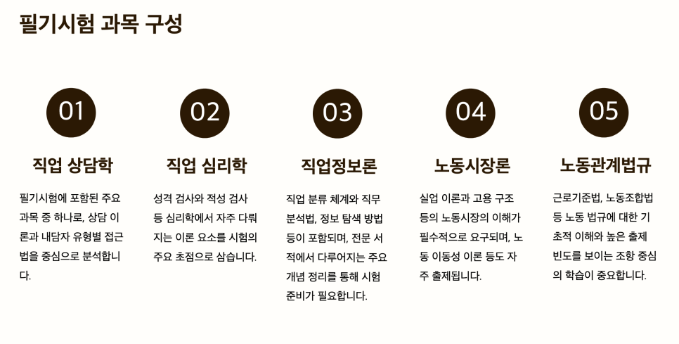 과목 수가 많아 보이지만, 실제로는 상담 이론과 노동·고용 구조에 대한 기본 이해를 묻는 문제가 중심이며, 기출문제 반복 출제 비중이 높은 편입니다.