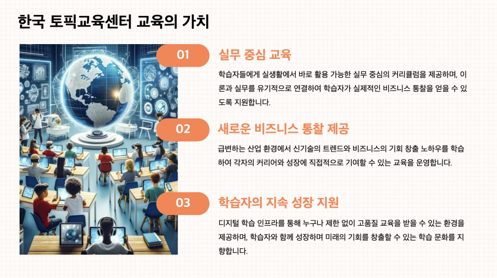 교육은 단순히 지식을 쌓는 과정을 넘어, 한 사람의 인생을 바꾸고 새로운 문을 열어주는 열쇠라고 저희는 믿습니다. 한국토픽교육센터(EDUTPK)는 학습자 여러분이 마주할 모든 도전의 순간에 든든한 버팀목이 되어 드릴 것을 약속드립니다. 끊임없이 진화하는 교육 콘텐츠와 따뜻한 학습 지원 시스템으로 여러분의 성장을 끝까지 책임지겠습니다. 지금 이 순간, 배움을 향한 여러분의 작은 결심이 미래의 큰 성공으로 이어질 수 있도록 저희가 함께 걷겠습니다. 홈페이지를 통해 더 많은 교육 과정을 살펴보시고, 에듀티피케이와 함께 찬란한 내일을 설계해 보십시오. 여러분의 꿈이 현실이 되는 그날까지 저희의 열정은 멈추지 않을 것입니다.