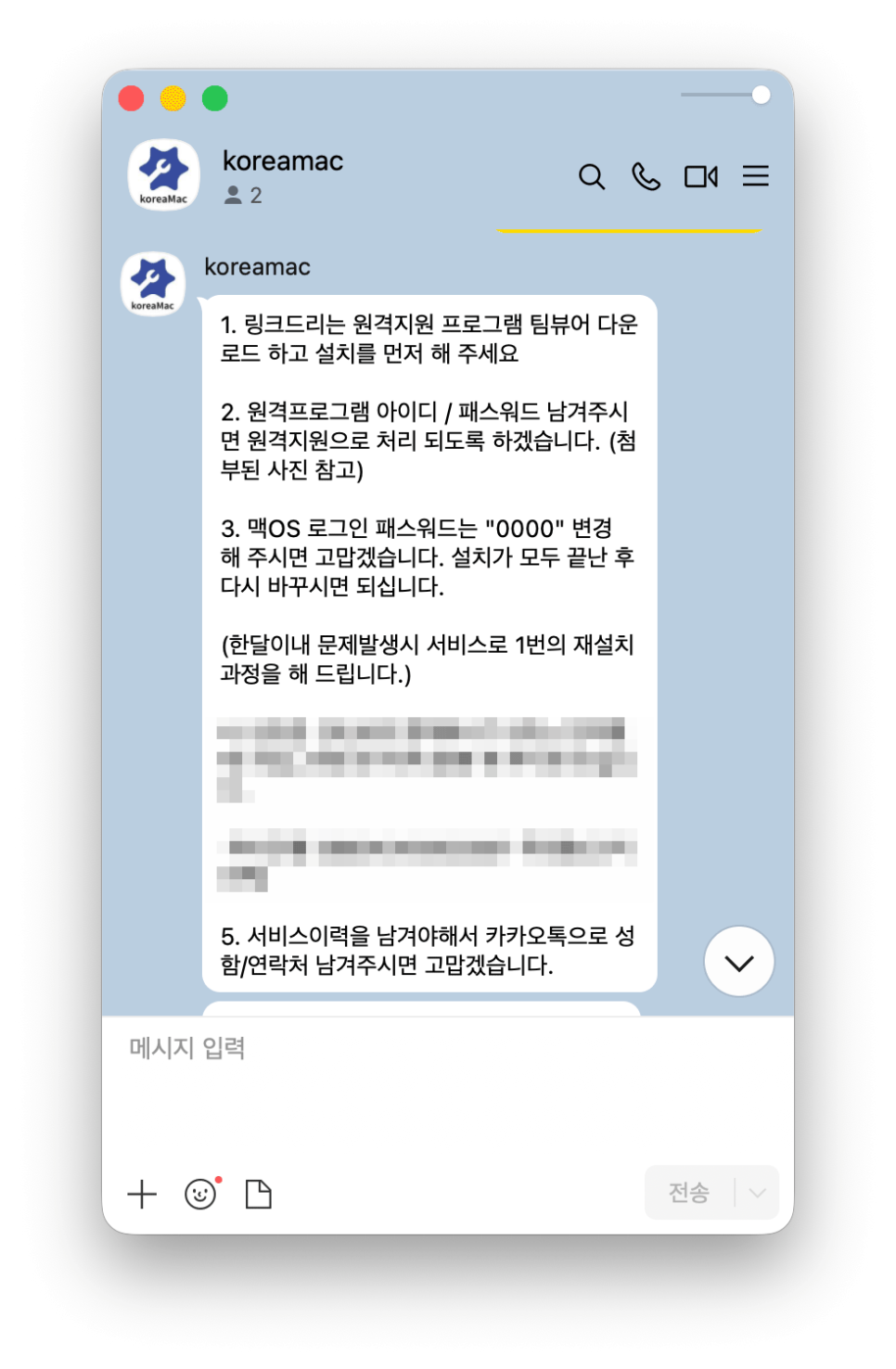 사용 중인 맥북 기종과 용도, 필요한 프로그램을 전달하면 설치 가능 여부와 진행 방식에 대한 안내를 받을 수 있습니다. 상담 이후에는 원격 설치를 위한 준비 사항이 카카오톡이나 이메일로 전달됩니다.