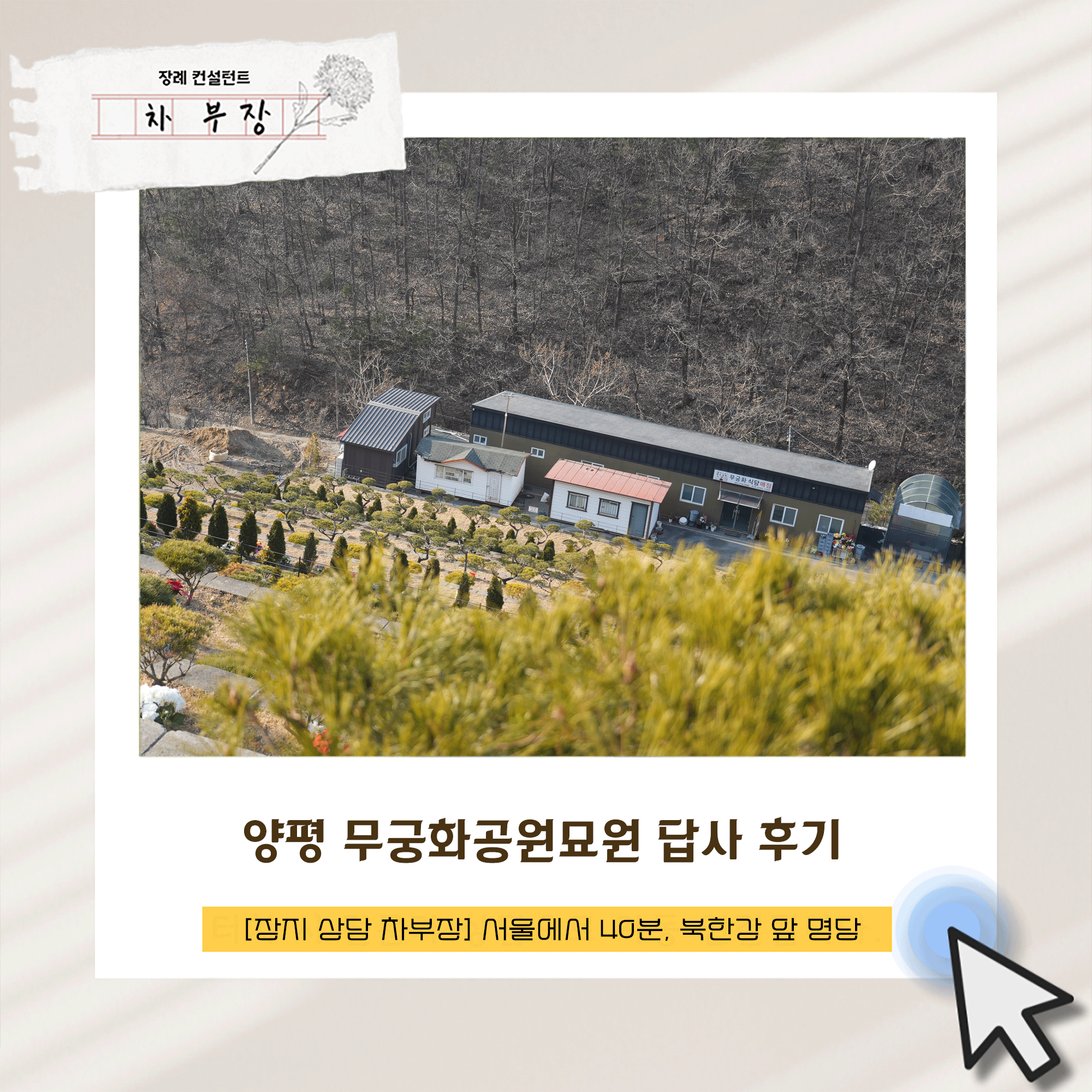 양평 무궁화공원묘원은 수려한 자연환경, 편리한 교통, 믿을 수 있는 재단이라는 삼박자를 고루 갖춘 명품 추모 공원입니다. 하지만 아무리 좋은 곳이라도 우리 가족의 상황과 맞지 않으면 최고의 선택이라 할 수 없습니다. 지금 장지를 고민하고 계신다면 주저하지 마시고 장지 상담사 차부장에게 연락 주십시오. 20년의 현장 경험과 진심을 담아 가족의 입장에서 함께 고민하고, 가장 합리적이고 평안한 안식처를 찾아드리겠습니다. 단순한 상담을 넘어 위로와 공감이 있는 만남을 약속드립니다. 언제든 부담 없이 답사 예약을 신청해 주시기 바랍니다.