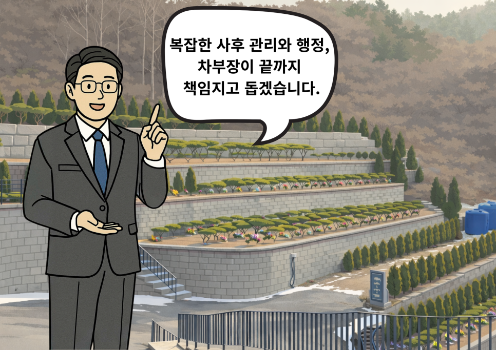 장지 계약은 끝이 아니라 새로운 시작입니다. 안치 이후에도 벌초 대행, 제례 서비스, 명의 변경 등 지속적인 행정 처리와 관리가 필요합니다. 개인이 관리 사무소와 직접 소통하다 보면 때로는 절차가 복잡하거나 소통이 원활하지 않아 답답함을 느낄 수 있습니다. 저는 계약 이후에도 유가족의 든든한 파트너로서 지속적인 사후 관리를 지원합니다. 20년 경력의 차부장이 구축해 놓은 네트워크를 통해 장지 관련 민원이나 불편 사항을 신속하게 해결해 드리며, 유가족분들이 언제나 편안한 마음으로 성묘를 다녀가실 수 있도록 곁에서 돕겠습니다.